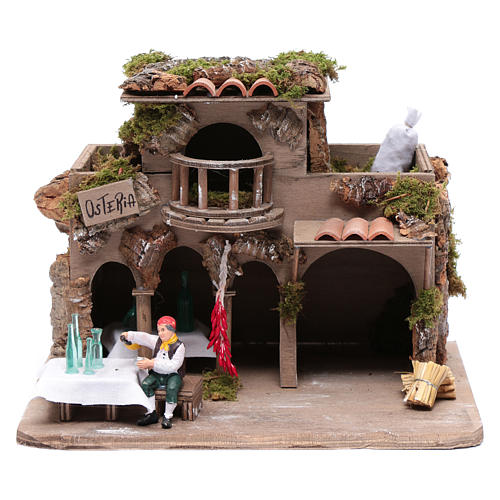 Inn with drinker for nativity scene 22x30x22 cm. Inn with two terraces and a semi circular balcony. In front of the inn there is a man sitting at a table and drinking. This setting is made in Italy with wood, cork and PVC. Suitable for 7/8 cm statues.