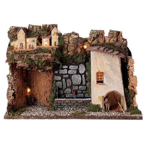 Illuminated village with cave and fountain with HK-200 pump. Made of wood and cork, suitable for 10-12 cm nativity sets. For the fountain to work, it is necessary to fill the basin with water and then insert the 220V plug in. Village setting made in Italy, dimensions 31x45x20 cm.