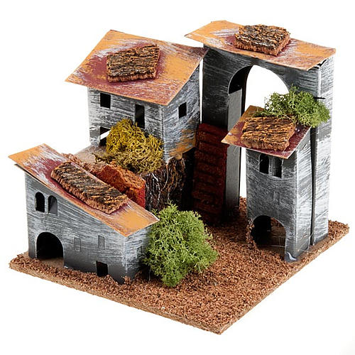 Nativity set accessory: paperboard houses with arch. Paperboard houses on a cork base covered with moss. Entirely hand-crafted in Italy.