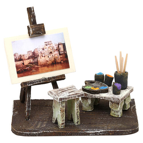 Painter's studio with easel for 10 cm nativity 9.5x11x7 cm. The nativity scene setting for a painter in a nativity scene with an easel, a table with paints, and a small bench.