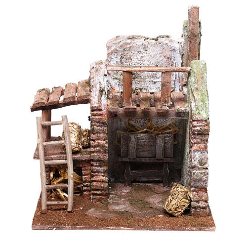 Beautiful nativity scene accessory with a small room with hay bundles and ladder. Adapted for a 10 cm nativity scene.