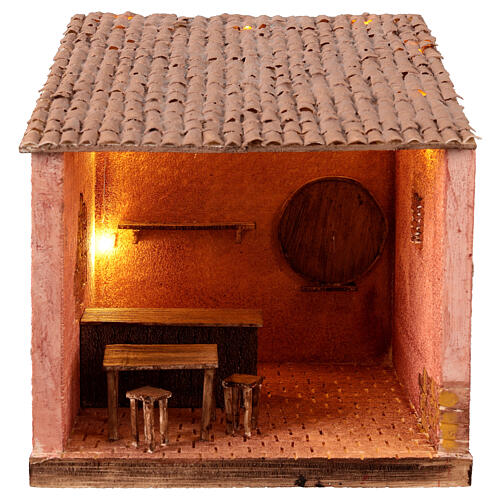 Tavern scene 25x25x20 cm for 12 cm nativity. This tavern nativity scene setting captures the essence of a typical tavern with precise details such as a counter, stools, shelves, and a wine barrel hanging on the wall. Crafted entirely in Italy, this setting is ideal for adding a touch of artisanal realism to your nativity scene. The scene also features a warm white LED light, controlled by a button on the back. This lighting, powered by two button cells, enhances the atmosphere of the place, making the tavern a visual highlight in your nativity scene. Ideal for 12 cm figurines. Actual scene dimensions: 28x26x22.3 cm. Made in Italy.