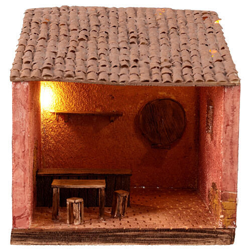 Tavern setting 25x25x20 for 10 cm nativity scene. This scene depicts the interior of a tavern, meticulously detailed with elements such as a counter, stools, a shelf, and a wine barrel attached to the wall. Suitable for figurines up to 10 cm tall, it enriches your nativity scene with a distinctive and artisanal touch, entirely produced in Italy. The scene also features a small warm white LED light that can be activated via a button on the back, powered by two button batteries, adding a cozy lumi...