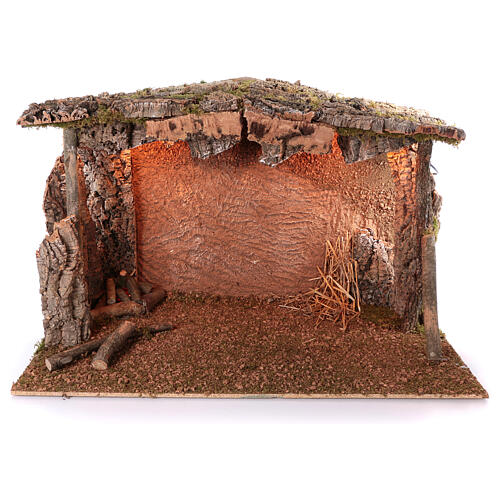 Simple nativity stable in wood with cork roof and internal lights with flame effect. The lights work with a 220V plug for 45-50 cm nativity sets.