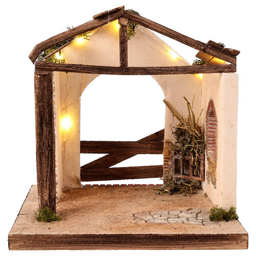 Nativity stable with LED lights, 25x25x20 cm for 12 cm figurines. This nativity stable, crafted in polystyrene by expert Italian artisans, measures 26.5x26.5x22 cm. Recreating the image of an ancient dwelling with a dilapidated roof and slanting beams, it offers an authentic touch and a sense of history. Designed to accommodate figurines up to 12 cm, this structure is perfect for enriching your nativity with a vivid depiction of classic narrative scenes. The meticulous attention to detail and precision in craftsmanship reflect the excellence of Italian artisanship, resulting in a unique and impactful piece. The nativity scene stable is illuminated by a warm white LED light string, emitting soft light, enhancing the realism. It operates on button batteries, eliminating the need for a direct electrical connection. Ideal for those seeking to add a touch of realism and historical charm to their nativity, this stable transforms any Christmas space into an evocative scenic narrative. 100% made in Italy.