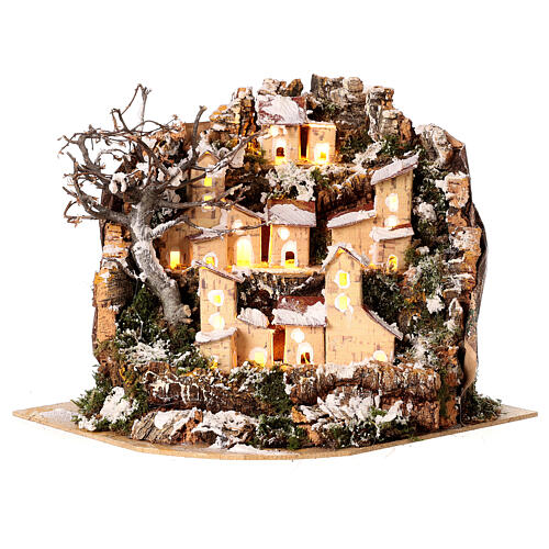 Snowy landscape with houses and lights for the nativity scene. The nativity village set measures 20x24x21 cm and is ideal for 10-12 cm nativity figurines. We can observe a snowy village with small houses that are positioned on various shelves. The houses are surrounded by a rocky wall made of cork and scattered moss.The setting can be illuminated by connecting the socket located on the back to a power supply. The landscape is perfect to be placed in perspective, making the nativity scene characteristic and original. The nativity village set is handcrafted and is made in Italy.