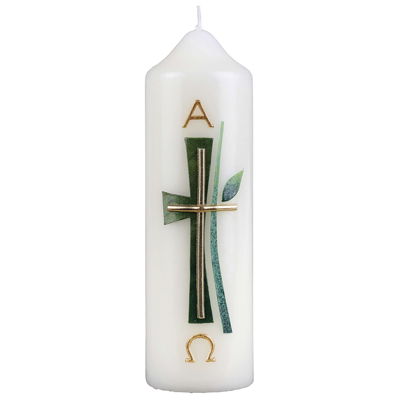 Candle green leaf grass cross 16x5 cm.White wax Easter candle, made in Germany and decorated by hand. The candle is characterized by a delicate decoration, with a green and gold cross next to a branch with a leaf.This candle is 16.5 cm high and 5 cm in diameter.