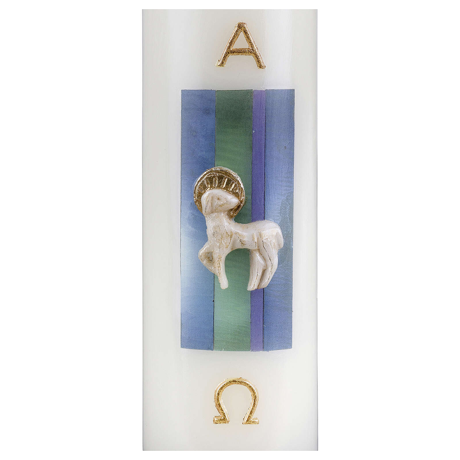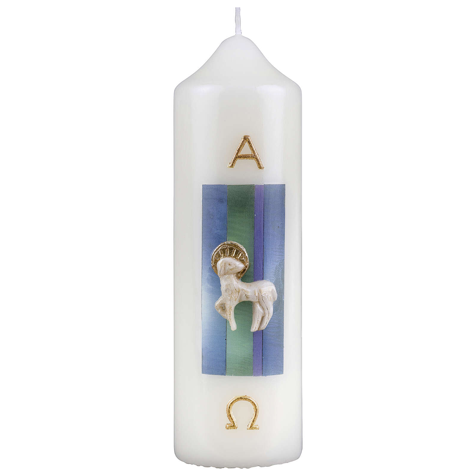 Paschal candle with lamb on the front. Behind the lamb, crowned by a golden halo, is a blue and green background. Above and below are the symbols Alpha and Omega in gold letters. This liturgical candle is 16.5 cm high and 5 cm in diameter. The beautiful candle is made in Germany where it is hand decorated by expert craftsmen of the sector.