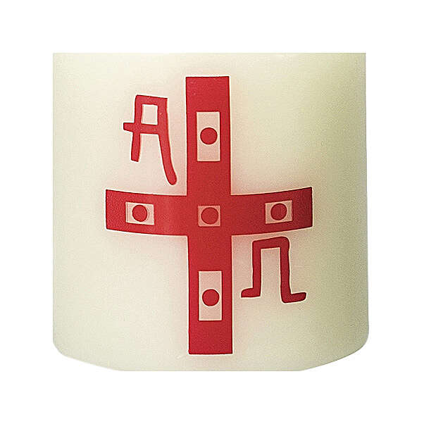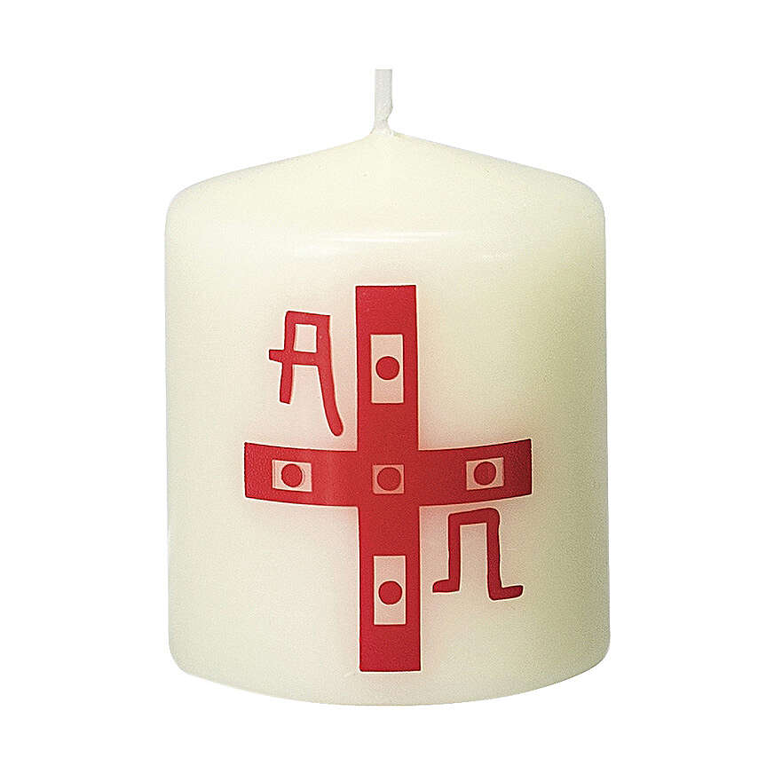 Liturgical candle in ivory color measuring 6 cm in height and 5 cm diameter. The candle is decorated with a red and white cross with the letters Alpha and Omega. Made in Germany at a factory with over 100 years of candle making experience.