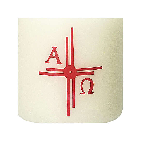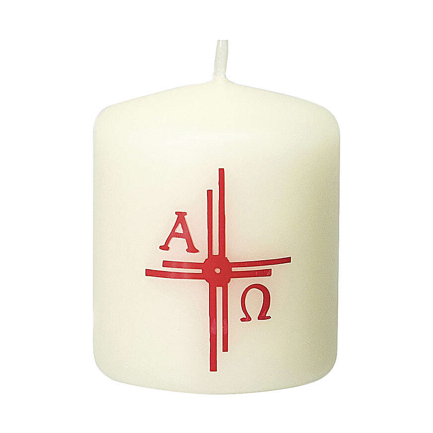 Candle with red cross rays 6x5 cm.Candle decorated with a double red cross, with the letters Alpha and Omega. This ivory colored candle is 6 cm high and 5 cm in diameter. Made in Germany.