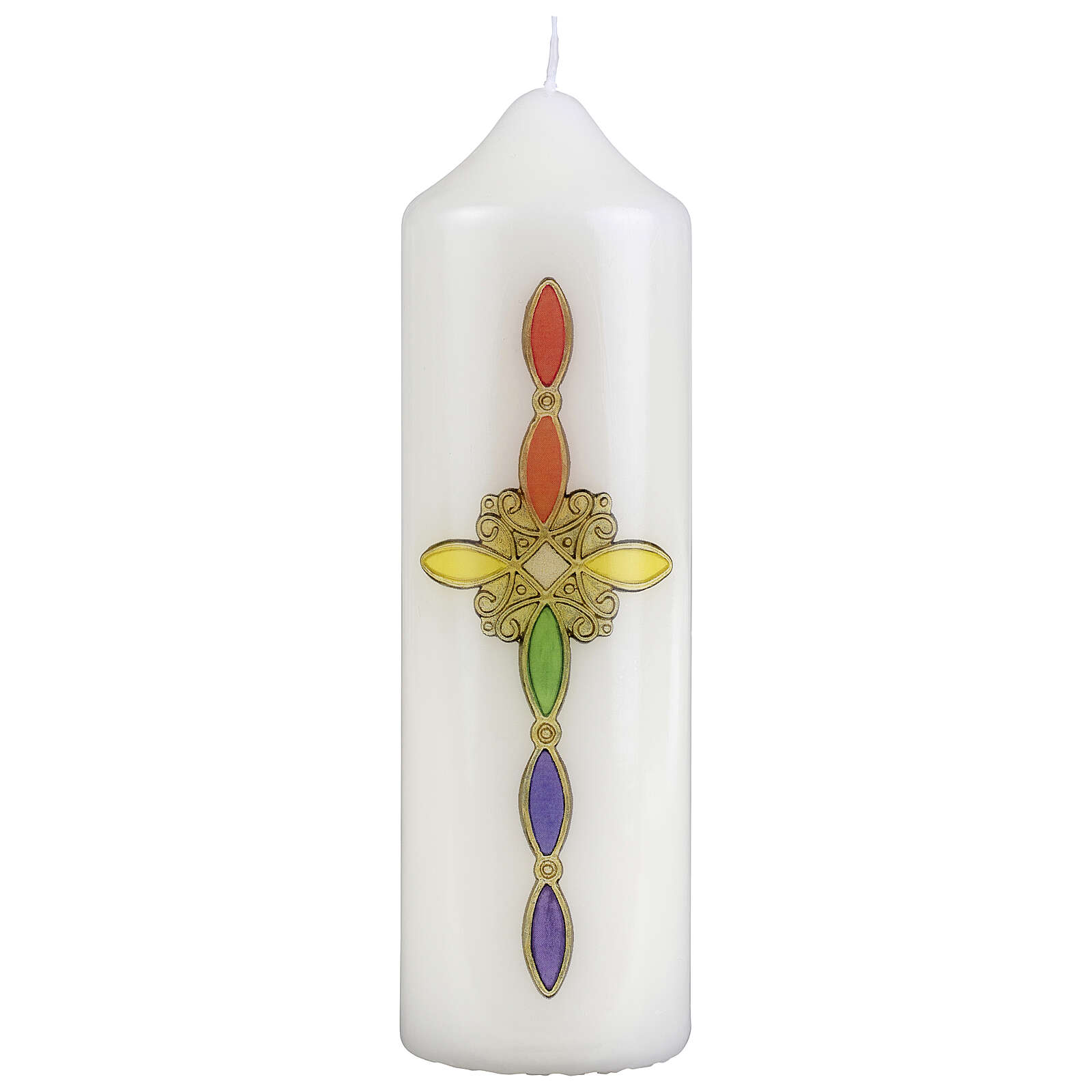 This candle is made of white wax and is decorated with an ornate cross. The arms are formed by small ovals in the colors of the rainbow. This paschal candle is made in Germany at a historic wax factory. It measures 16.5 cm in height and 5 cm in diameter.