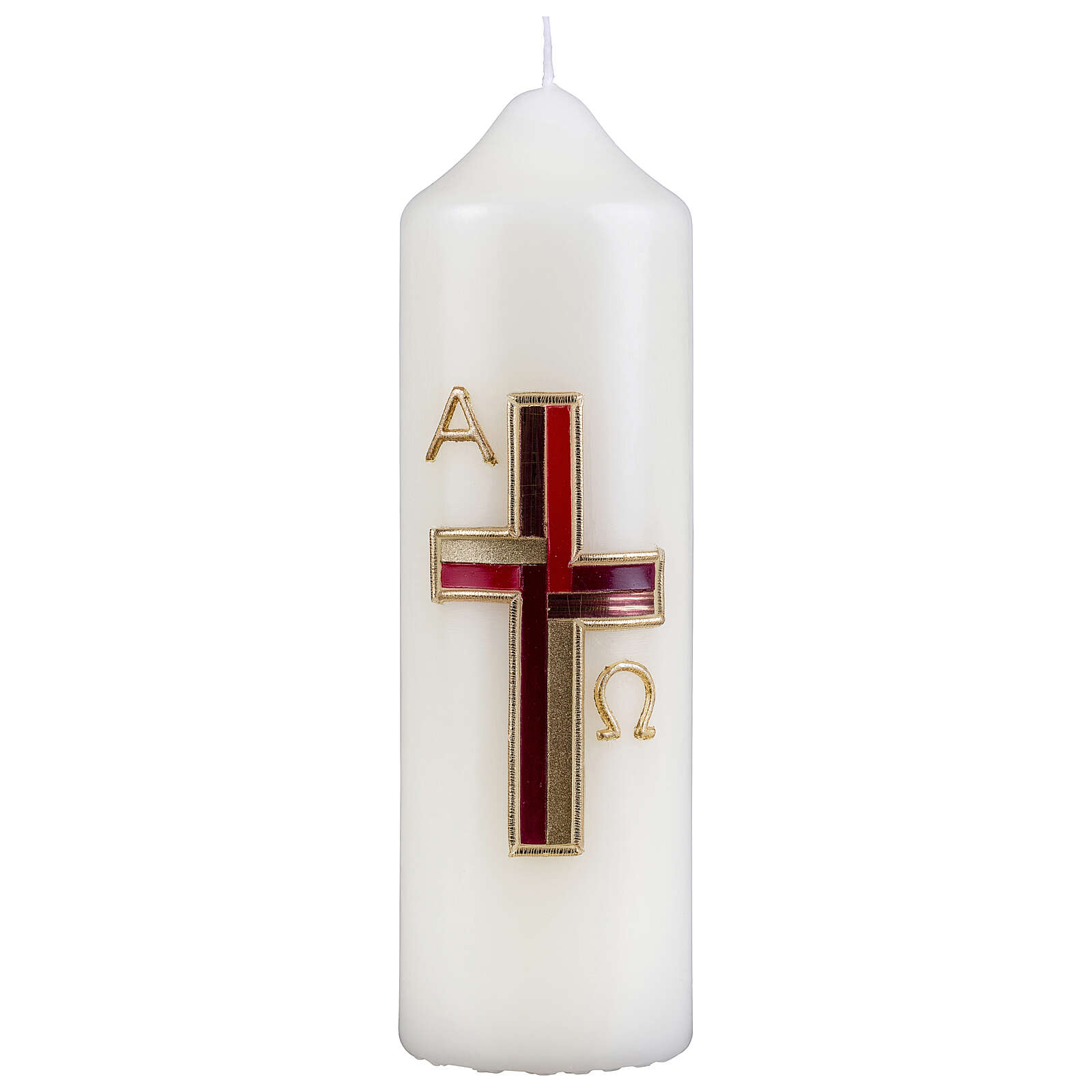 White wax liturgical candle, made in Germany. It is hand decorated by expert candle artisans. On the front, there is a cross colored with golden and red strips, and decorated with the symbols Alpha and Omega. This beautiful candle is 16.5 cm high and 5 cm in diameter.