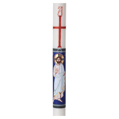 White Paschal candle adorned with a hand-painted image of Christ blessing, measuring 120 cm in height and 8 cm in diameter. The centerpiece features Jesus with his right hand raised in blessing gesture. Above the image, a stylized red cross stands out, while the symbols of Alpha and Omega appear at the top and bottom. This church candle, made in Italy by a longstanding company established in 1908, is renowned for its craftsmanship, attention to decorative details, and the use of high-quality paraffin. Designed to add solemnity and profound symbolic meaning to Easter celebrations, this 120 cm tall candle is ideal for the liturgies and solemnities of Holy Week. Crafted from paraffin and cotton, this Easter candle is a product of Italy.