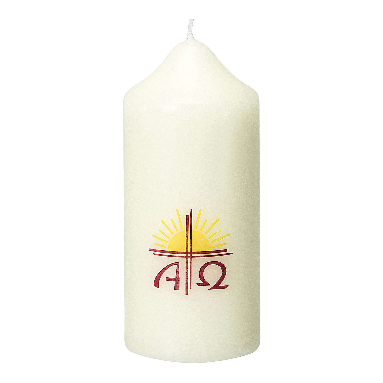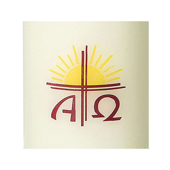 Ivory candle with yellow sun cross 115x50 mm.Church candle in ivory with yellow sun, red cross and Alpha Omega symbols. This candle measures 11.5 cm and has a 5 cm diameter. Made in Germany.