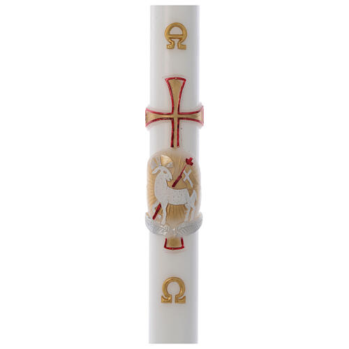 Lamb and cross Paschal candle in white wax with gold and red 8x120cm.