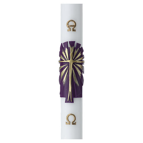 Church Paschal candle in white wax, height 120 cm and diameter 8 cm, with a uniform pale surface and low-relief decoration. At the center, there is an applied stylized radiant cross mounted on a purple base, with Alpha and Omega in relief at the top and bottom of the candle.