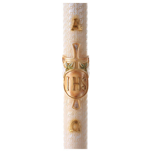 Church Paschal candle JHS cross embroidered white, 120x8 cm.Unique Paschal Easter candle made of high quality paraffin wax. This material is resistant to high summer temperatures, and allows the candle to remain solid. The Paschal candle is 100% hand painted by Italian artists. The candle is decorated with a cross with the words JHS and a quilted background.This beautiful candle for Easter measures 120 cm in height and 80 mm in diameter.