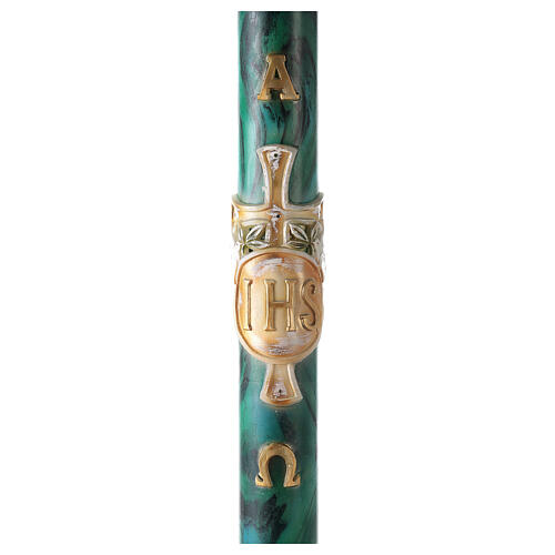 Paschal Candle JHS marbled spots.The Paschal Easter candle is made of high quality paraffin wax, a material resistant to high summer temperatures. The Catholic Easter candle is produced following the historical traditions of a specialized wax factory in Italy. The Paschal candle is decorated with a marbled background and a cross with the letters JHS. The Easter candle measures 120x8 cm.