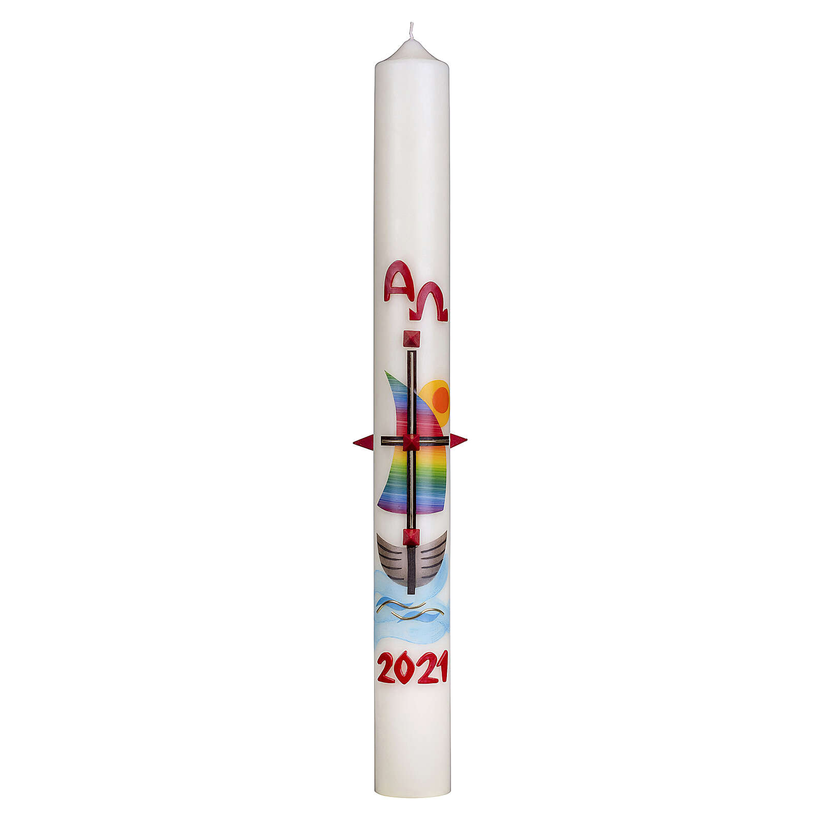Paschal candle rainbow sail boat 80x8 cm beeswax.