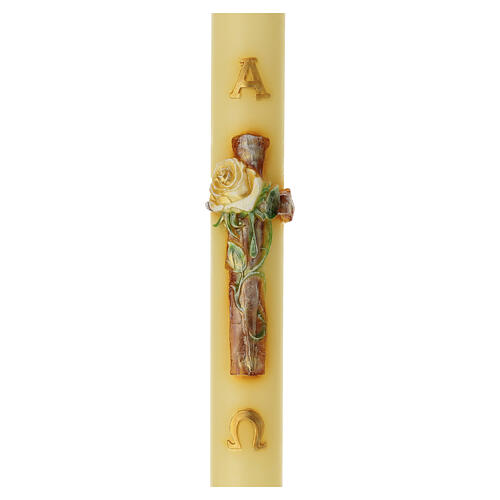 Paschal candle in refined paraffin, cast with a cross in relief and a white rose applied as an ornamental element. The cylindrical ivory body features a vertical cross finished in gold and a modelled flower at the base, complete with green leaves in relief arranged along the central line. Handcrafted by an experienced Italian candle-maker with careful attention to the floral details. This Easter candle will last approximately 200 hours. Dimensions 8x120cm (diameter 80 mm, height 120 cm).