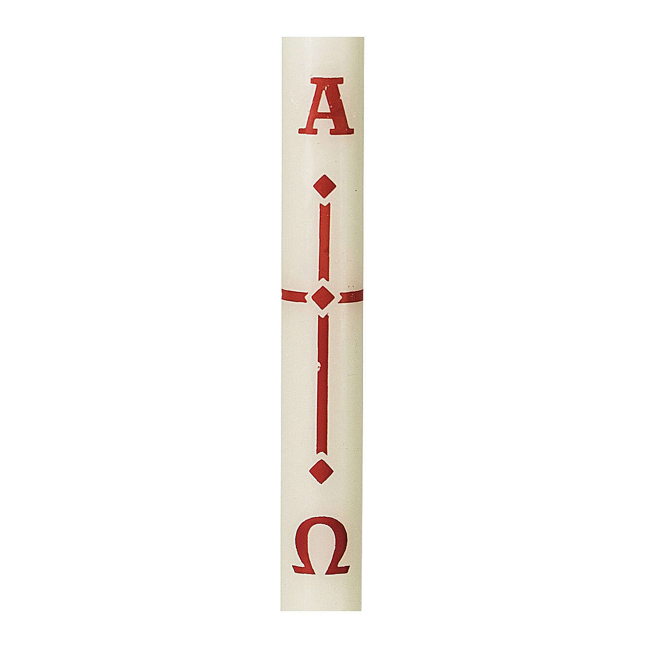 Ivory taper candle with red Alpha Omega letters and cross with squares in the center and at the ends. The candle measures 19 cm in height and 1.6 cm in diameter. Made in Germany at a historic wax factory.