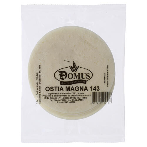 Large Communion hosts, 143 mm, 1.4 mm thick. Unleavened wheat bread intended for Eucharistic concelebrations, made from Type 00 wheat flour and water for use in the Eucharistic liturgy. Round host with a uniform light-colored surface and a liturgical symbol impressed using a mold on the baking plate. Prepared in compliance with the norms established by the Congregation for the Doctrine of the Faith for the production of hosts for worship. Suitable for use during Mass and concelebrated liturgical celebrations; package contains 5 pieces, diameter 143 mm, thickness 1.4 mm.