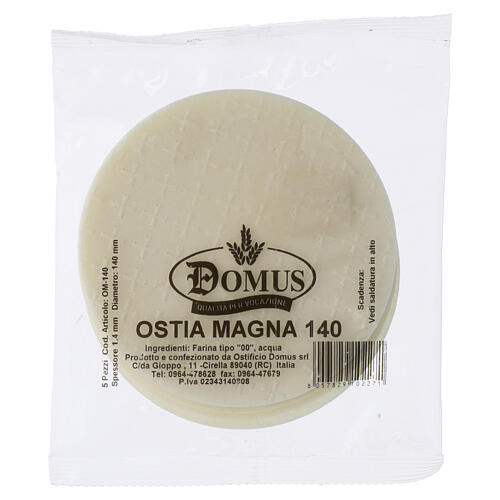 Round host with a light-coloured surface and a liturgical pattern, the central Greek cross impressed by a mould. Prepared using water and Type 00 wheat flour in accordance with the canonical preparation of hosts for worship. Suitable for Mass and for the Exposition of the Blessed Sacrament during Eucharistic adoration and other liturgical functions. Pack contains 5 pieces; diameter 140 mm, thickness 1.5 mm.