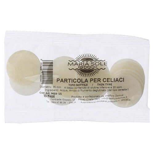 Thin Communion hosts for celiacs, 35 mm - pack of 15 pieces. Eucharistic hosts for liturgical celebration, made with raw materials suitable for producing hosts with low gluten content. Circular hosts with a pale surface and a thin structure obtained by pressing the liturgical mold. Manufactured in accordance with canonical requirements for liturgical hosts with a gluten content below 20 ppm. Intended for distribution of Communion during Mass. Pack contains 15 pieces. Diameter: 35 mm. Thickness: 1 mm.