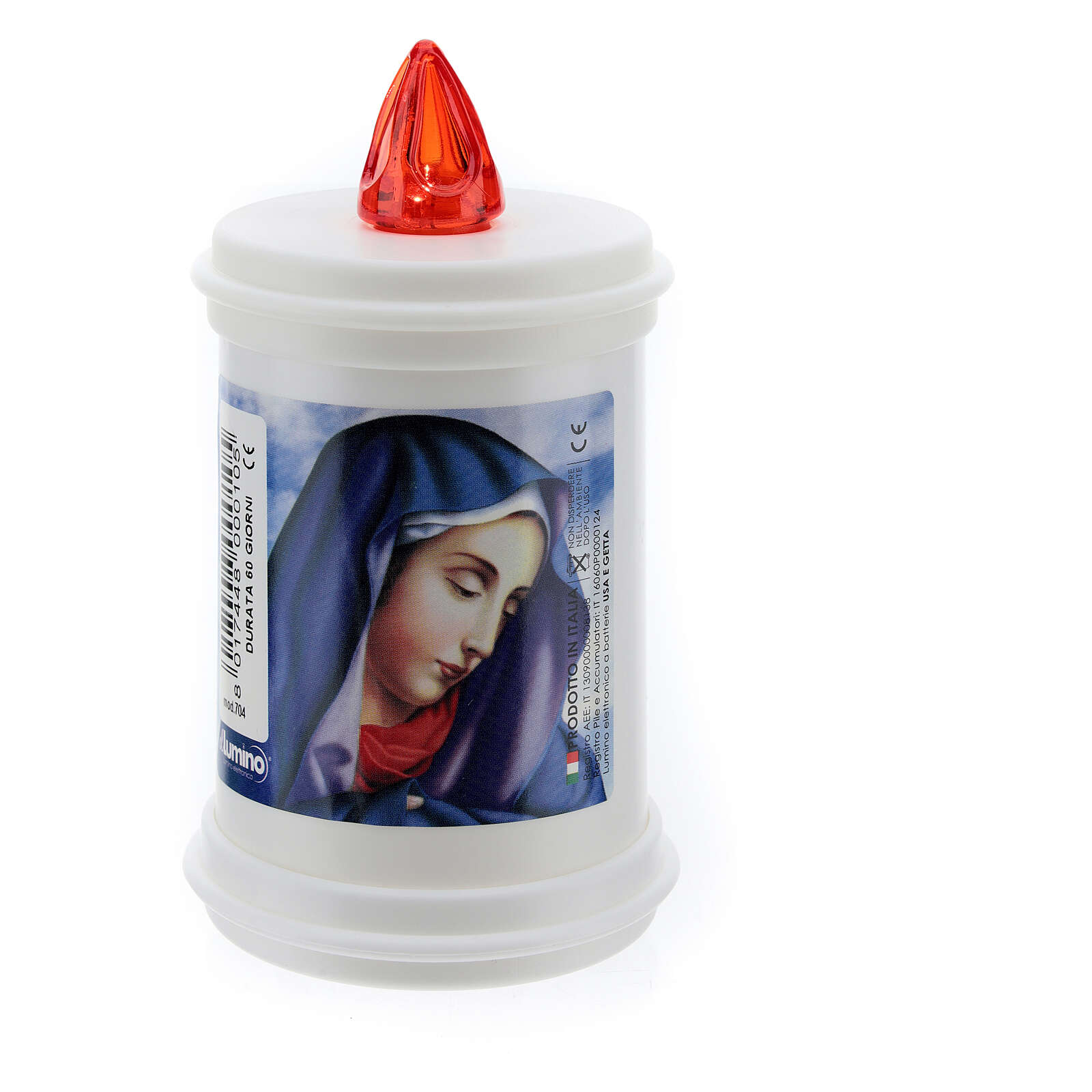 Electric votive candle in white plastic, throwaway. This Led votive candle has a duration of 60 days. Available in various immages with prayer on the back (in italian).