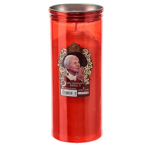 The white votive candle has a red candle holder depicting St. John Paul II. The tea light wax candle has a diameter of 8 cm and is 20 cm high.The votive candle is handmade in Italy by specialized artisans. The standard-level technique used for mass production is called extrusion. The powdered wax is compacted under pressure.Duration approximately 6 days.