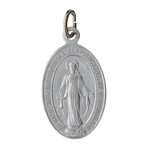 Pack of 100 aluminum medals with a silver finish, featuring inscriptions in Spanish, each measuring 2.2 x 1.5 cm. The front displays the image of the Virgin with the phrase "Oh María concebida sin pecado, ruega por nosotros que recurrimos a ti". The back features the traditional symbol of the Miraculous Madonna. Handcrafted product made in Italy, ideal for favors, devotional items, or parish initiatives. The white finish adds a luminous and discreet touch to the medal.