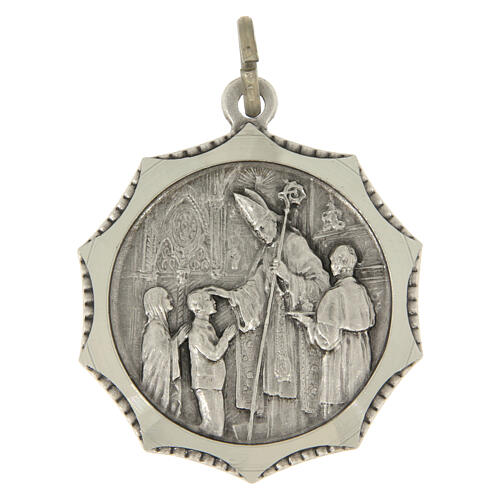 Decagonal nickel silver Confirmation medal, 32 mm. This Confirmation medal is crafted from nickel silver with a silver finish, featuring a decagonal shape and an elegant contrast between the polished frame and the matte surface. The obverse depicts the scene of Confirmation, symbolizing the descent of the Holy Spirit and the strengthening of the Christian faith. The reverse is engraved with the phrase "Remembrance of Confirmation," in Italian, to preserve the memory of this sacrament. Made in one of Italy's most renowned artistic foundries, specializing in the crafting of sacred metals. This foundry, with its long tradition, has passed down its craftsmanship for generations, creating high-quality works with refined techniques and precious materials.