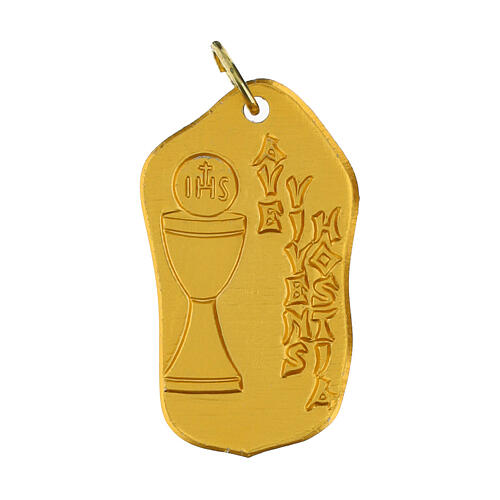 Gold 3x3 cm Communion medal. This immaculate medal, 3.5 cm high and 3 cm wide, is a symbol of deep and meaningful faith. The front depicts a chalice topped with a host with the inscription ''JHS'', acronym for ''Jesus Savior of Men'', accompanied by the phrase ''Ave Vivens Hostia'', celebrating the mystery of the Eucharist. On the back, the medal bears the inscription ''Memory of my First Communion'', making it a special and precious gift to celebrate this important sacrament. Created by one of Italy's most renowned artistic foundries, characterized by definition and richness of minute and high-level details.