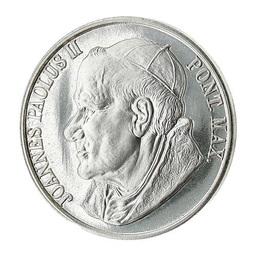 40 mm Coin of Pope John Paul II. The front of the coin features the profile of Pope John Paul II, surrounded by the inscriptions ''Joannes Paulus II'' and ''Pont. Max.'', symbols of his authority and pontificate. The back bears his papal coat of arms, the official emblem of his service to the Church and the world. Crafted by one of Italy's most renowned artistic foundries, known for its high-level precision and rich detail.
