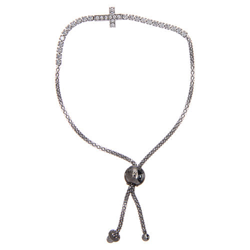 Amen bracelet in 925 sterling silver with white zircons and central cross. The length of the bracelet is adjustable thanks to a sphere equipped with latch. Jewel weight: 3,2g