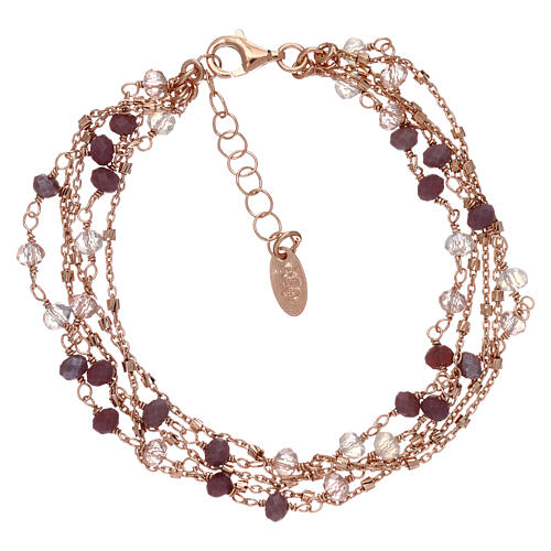 This Italian crystal bracelet has 5 chains in rose silver with different beads in purple tones. Adjustable from 16 cm to 19 cm. A guaranteed high quality product. Weight: 5.5 grams.