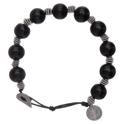 Dozen rosary bracelet with 12 mm black wooden pearls inserted on a cord and separated by silver plated thread and a Saint Benedict's medalet.