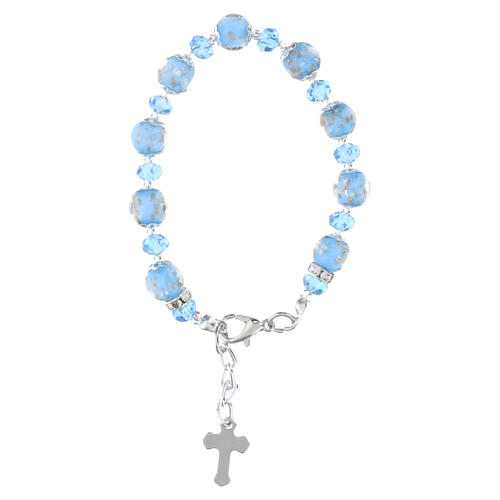 ROSE Christian bracelet composed of 10 mm Murano glass beads in sky blue alternated with 5 mm faceted Bohemian crystals, silver finish. The sky-blue Murano beads have a smooth, glossy surface paired with faceted crystals that catch and reflect the light; beads are mounted on a technical cord with silver-plated metal findings. A small silver cross charm is set along the bracelet strand. Adjustable length 18–22 cm with a lobster clasp; silver-tone metal-alloy components suitable for skin contact. ...