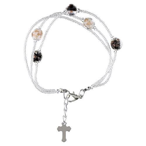 Three‑wrap Manin bracelet with alternating black and white 5 mm Murano glass beads on a high‑flexibility technical wire core. Each bracelet ends with a delicate silver‑finished cross. Lobster clasp with extension chain allows length adjustment from 18 to 22 cm. The beads are lamp‑worked by hand in the Murano tradition; slight variations in surface and color attest to the artisanal workmanship. Created by SOSPIRI VENEZIA and supplied with an official quality certificate and Made in Italy guarantee. It is delivered in a rigid black gift box with molded interior, ideal as a gift. Ideal Christian gift for loved ones.