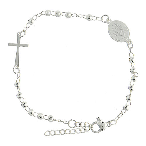 One-decade rosary bracelet in 316L steel with crucifix 1.5X1 cm and Miraculous Madonna medal with a diameter of 1 cm. It has 2 mm silver beads and has a total circumference of 20 cm, of which 3 cm are formed by a chain which, thanks to the different rings, it is adjustable. At the opposite end of the chain there is a lobster clasp that attaches to the rings.This rosary bracelet is made in Italy.