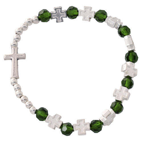 One decade rosary bracelet in plastic with 3x3 mm green beads.This beautiful Catholic one decade rosary bracelet has green beads, small cross charms and a metal cross.