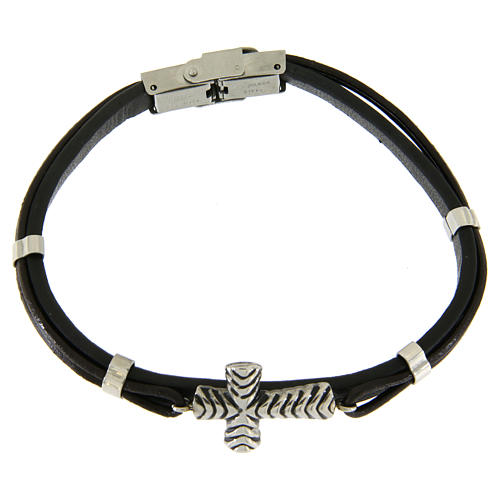 Bracelet in leather and steel characterized by applications, a silver manufactured cross. This casual bracelet for men made of leather has minimal details in steel, and weighs 9,70 grammes.