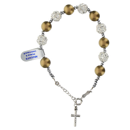 Bracelet with brown pearls, rhinestones, white crystals, 925 rhodium silver.Decade rosary bracelet handcrafted in Italy, with brown shell paste pearl beads and rhinestones with white crystals. The 10 mm diameter beads are interspersed with silver faceted hematite beads. The bracelet is completed with a silver cross pendant. The rosary bracelet has a rigid cable core. It is made of 925 silver and resists darkening thanks to the precious rhodium finish. 23cm long, weighs 17g.