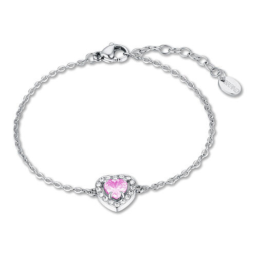 Pink zircon heart stainless steel bracelet. Adjustable 19 cm bracelet, adorned with a 1 cm pink heart solitaire, framed by small white zircons that enhance its brilliance. With a refined and lightweight design, weighing 2.2 g, perfect for adding a luminous and sophisticated touch to the wrist.