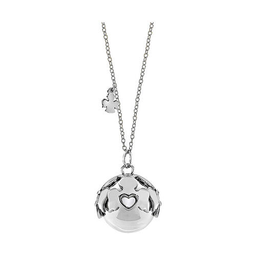 Adjustable Angel Caller Necklace 90-95 cm, enriched with a delicate 1 cm metal angel-shaped charm. The 2 cm round pendant is adorned with four angels surrounding it, each with a heart on their chest. A symbolic and refined jewel, made in Italy by Amen, a brand synonymous with quality and reliability. The jewel weighs 17 g.