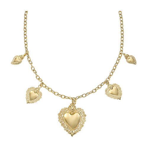 Elegant AMEN Golden Necklace with 925 Silver Multi-Charm Sacred Heart. Crafted in 925 silver with a radiant golden finish, this sophisticated Christian necklace features 5 Sacred Heart charms, including a central charm measuring 4x3 cm. Made in Italy, it comes with a warranty certificate, gift box, and AMEN shopper. Jewelry weight: 16 g.