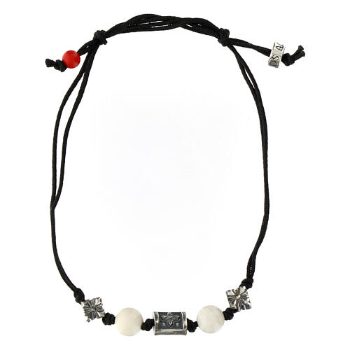 Agios bracelet with white stones in eco-friendly fabric. Religious bracelet made of eco-sustainable fabric by expert Tuscan artisans. This bracelet is suitable for a gift idea suitable for any occasion. By pulling the laces you can adjust the width of the bracelet. In the center, there is a charm depicting a cross and next to it there are two white stones. It belongs to the Calidum collection by Agios.All jewels come with an elegant cream-colored box and bag with burgundy handles and the Agios l...