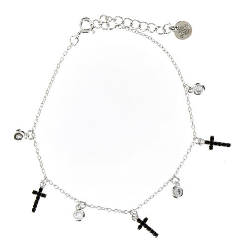 Agios cross charm bracelet black zircons 925 silver. This Christian bracelet was made of 925 silver and is made up of three cross-shaped charms with small black zircons. There are also four white zircons set in an English style, i.e. in a continuous circular support around the stone which also has a continuous edge that holds it. It belongs to the Icona collection by Lumae Charms.All jewels come with an elegant cream-colored box and bag with burgundy handles and the Agios logo printed in the cen...