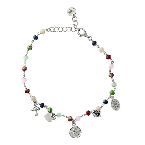 Agios silver love bracelet pink green beads.Christian bracelet characterized by numerous pendants with medals, hearts and crosses. This religious bracelet is made of 925 silver with a rhodium finish, with beads in colored stones in shades of green and pink.The bracelet is part of the 'Icona' line signed by Agios, a jewelry brand made in Italy by expert goldsmiths and focused on the themes of faith and the Pope's words.Ideal as a gift, this bracelet is shipped together with a box and bag.