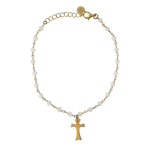 It features a pendant depicting a golden cross and the bracelet is embellished with white stones. The cross charm bracelet is shipped together with a box set and a shopper bag.